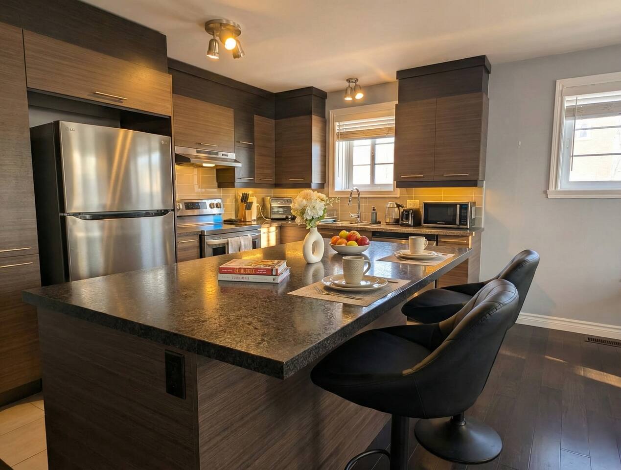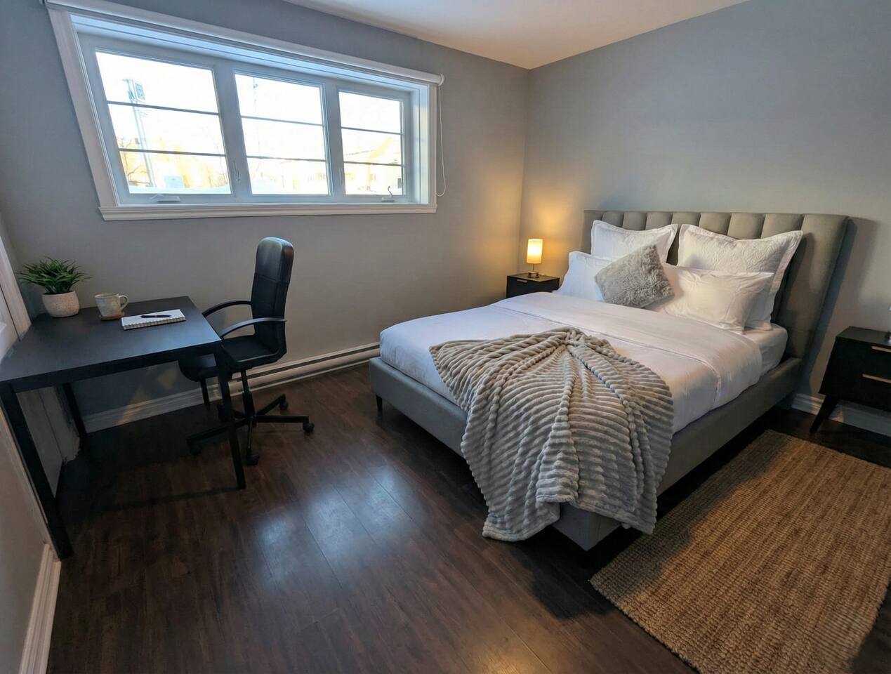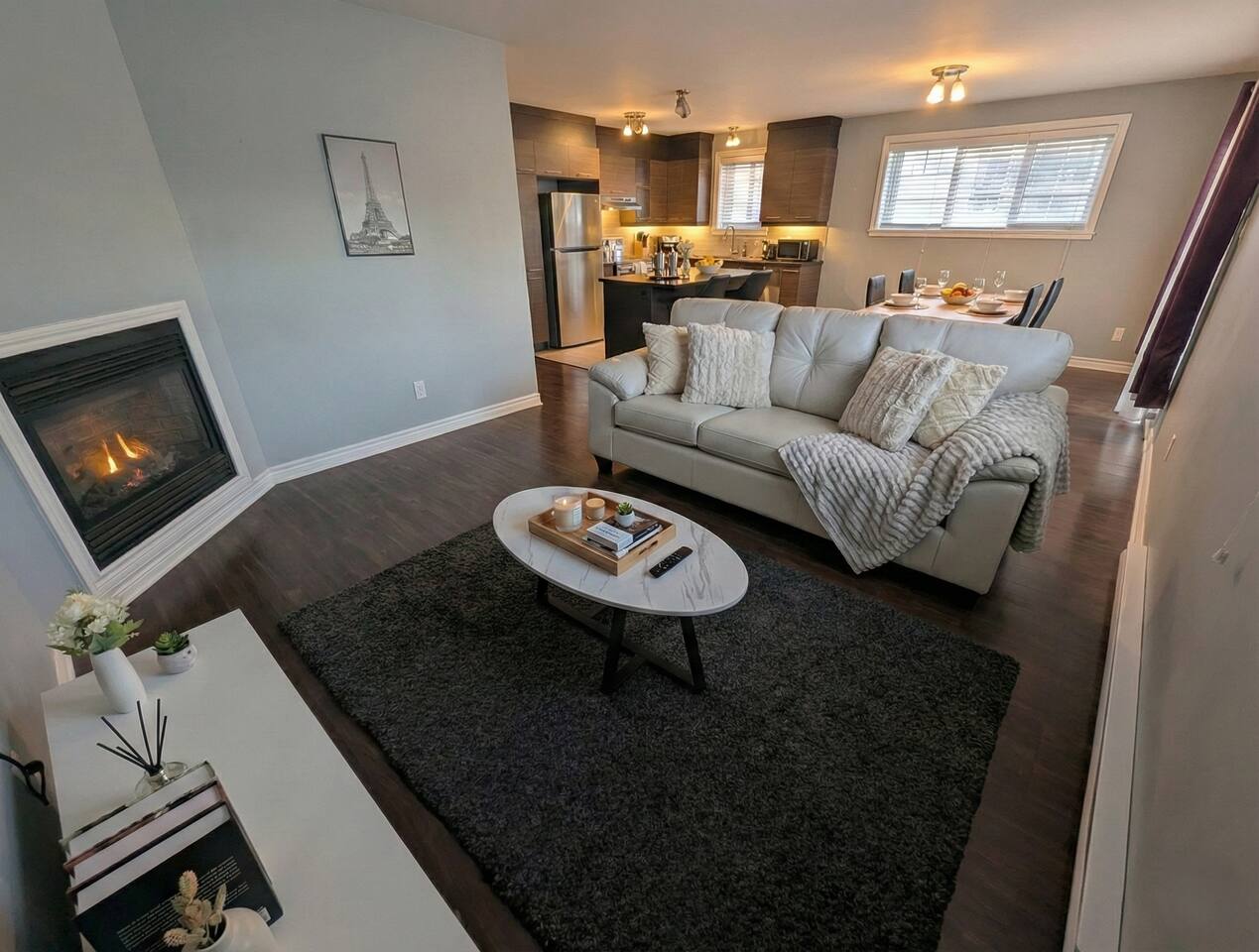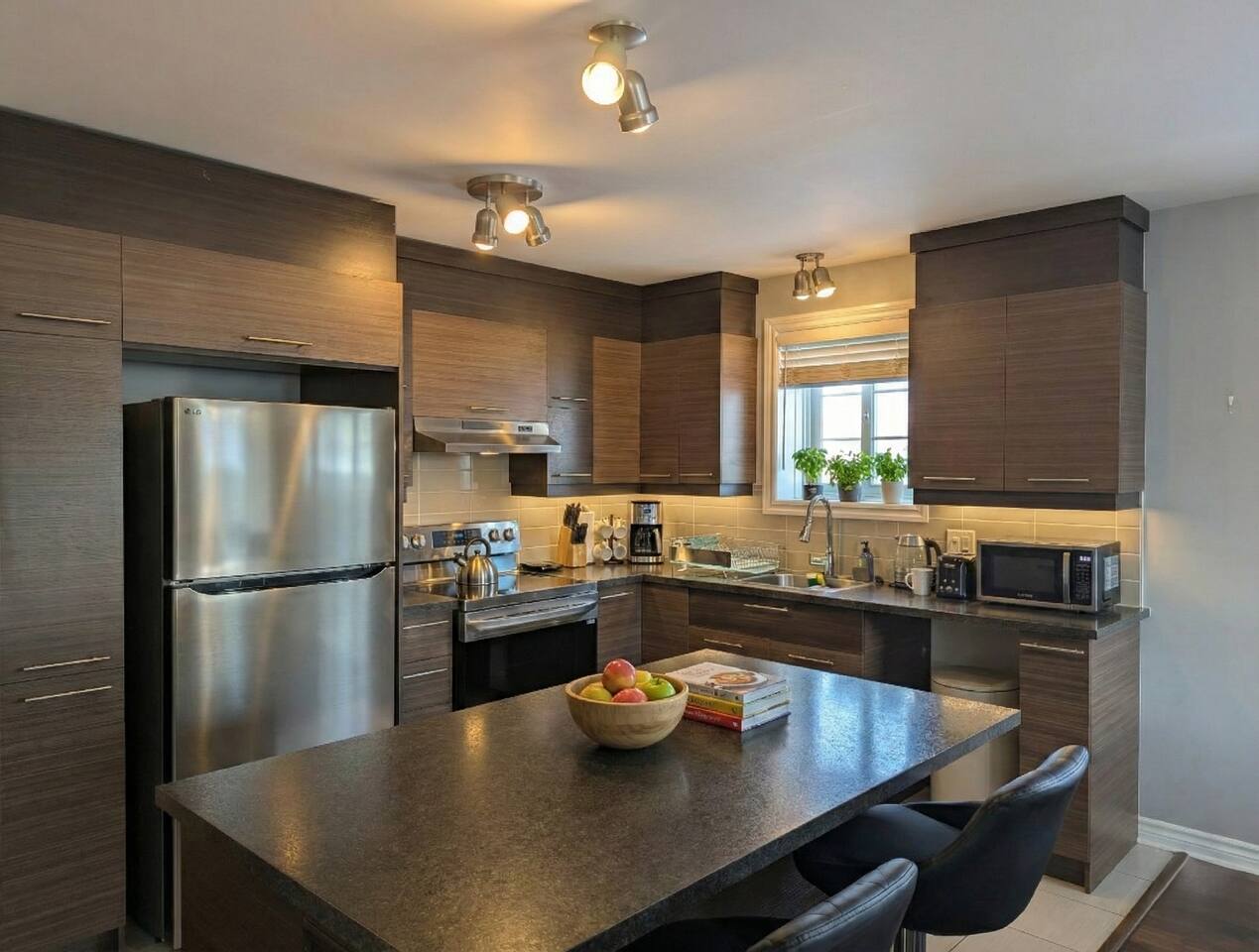 Unwind in total seclusion. This self-contained retreat is entirely yours, featuring a private side entrance thoughtfully designed to offer you a completely undisturbed and relaxing experience. • Smart Lock Access: Enjoy the freedom of independent, secure self check-in at any hour of the day or night. • Two Free Parking Spots: A rare convenience—park up to two vehicles easily in your own dedicated spaces. • Effortless Transit: Exceptionally close to YUL (just 15 minutes away), ensuring a smooth and incredibly convenient start and end to your trip.