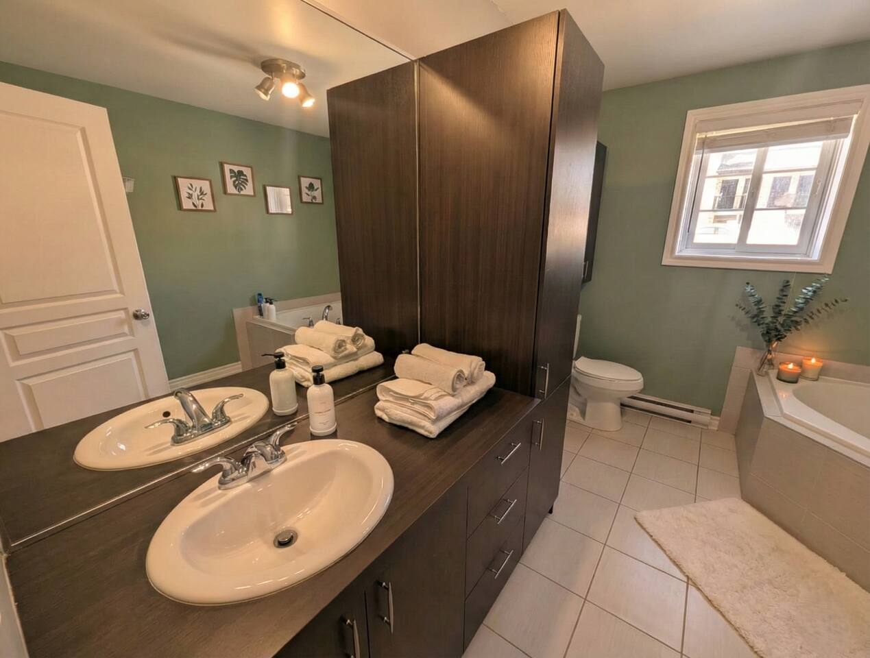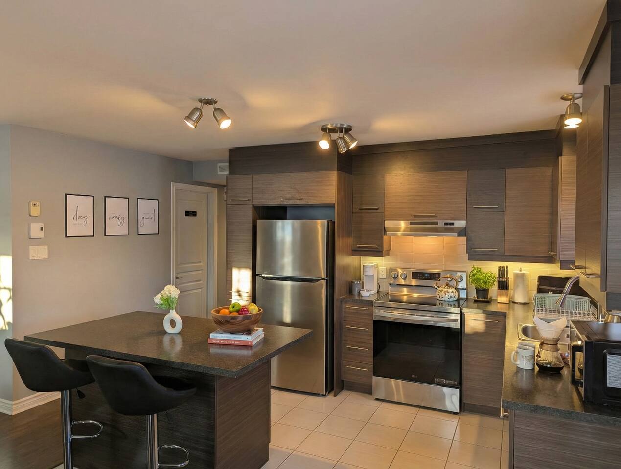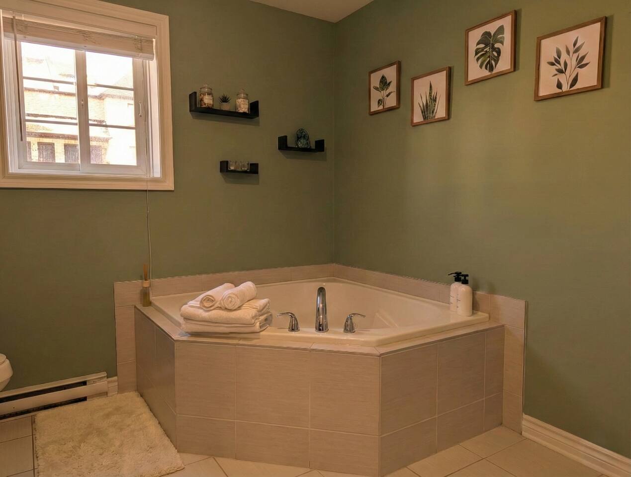 • Quick Commute: Touch down and check in effortlessly—your stylish sanctuary is a mere 15-minute drive from YUL Airport. • Cozy Living Space: Kick back on the ultra-comfortable sofa and catch up on your favorite streaming shows on the spacious Smart TV. • Remote Work Ready: Get things done at the dedicated desk setup, powered by high-speed Wi-Fi for seamless remote work or virtual meetings. • Gourmet Kitchen: Whip up meals in a streamlined, fully-stocked kitchen equipped with top-tier appliances and a complimentary Keurig coffee station (pods included!). • Restful Bedroom: Drift off in your tranquil private bedroom, featuring a plush queen-sized bed and a bonus second Smart TV for cozy movie nights. • Your Personal Spa: Elevate your stay with an exclusive hot tub—the perfect remedy for travel fatigue or a long workday, reserved entirely for you. Outdoor Sanctuary • Spacious Balcony: Step outside to your generous private balcony, the ideal spot for your morning brew or an evening glass of wine. This space delivers a rare combination: unmatched convenience, a work-ready environment, and a high-end private retreat.